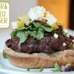 - Next, it’s time to assemble! Bun plus your burger patty, some arugula, a bit of sautéed onion, a little of the chopped pear and bleu cheese.